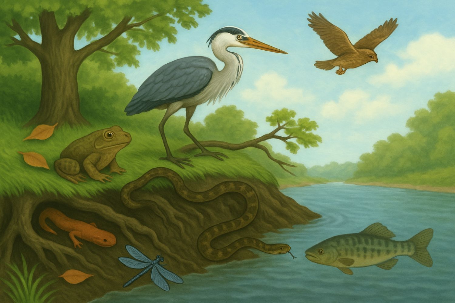 |  |  |  | Living Waters | Let’s Bank On It If you’re going with the flow, you’re bound to follow the bank – the stream bank that forms the edges of a stream channel. It’s a dynamic zone, shaped naturally by the water, plants, and animals that live there. Stream banks direct the flow of water and support a diversity of wildlife. Take a look at how various creatures may interact with this place. The roots of a tree hold the stream bank in place; its leaves fall into the stream becoming food and hiding places for aquatic insects that may be eaten by fish. The tree’s branches provide a perch for a Belted Kingfisher and a Great Blue Heron as they survey the water for their next meal. Nestled within the damp, stable conditions of a dead tree’s root ball, a salamander feeds on small insects and hides from potential predators. Without a sound, a common garter snake slides into the crevice and consumes the salamander. Later, as the snake returns to her den under a large, embedded rock, she becomes prey to a hawk who feeds her babies at the top of the tree. It’s the circle of life, where every member depends on access to clean water — and where many of us find peace in connecting with nature. There are 4,000 miles of streams in the French Broad watershed, and many miles of these streamside habitats were stripped of vegetation during Helene. Check out our recent video on how to revegetate a mild to moderately eroding stream bank. |